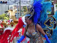 2002年8月31日 (土曜日) 浅草サンバカーニバルは、毎年8月の夏の終わりに、約50万人の観客が熱狂的な「サンバ」のリズムと踊り、華麗なコスチュームに酔いしれる。強烈な生サンバ音が沿道見物人の耳をしびれさせる。 馬道通りから雷門通りをパレードしながら思いっきりのパフォーマンスを見せてくれる。 しかし、私は遅れてきたので止むを得ず、見物人の後ろで人の頭の上からデジカメを構える。カメラアングルには他人の頭の面積が一番多い。手をあげていると疲れてカメラが震えてくる。やっと撮れた写真を紹介します。本当はもっと下からのカメラアングルで撮りたかったのですがね。 |