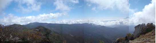 | 金峰山の山頂から、富士山方向のパノラマ 手前左側の山が左側から朝日岳、鉄山。 奥の稜線は国師ケ岳。北奥千丈岳も見えてるのか? 右側雲の上に富士山だ! 乾徳山も富士山の左にある筈だが? |