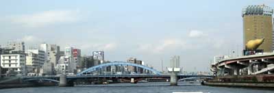 ![]() 左側が浅草・雷門、右側は向島、本所方面 水上バスの桟橋は、この橋の左側上流にある。 |