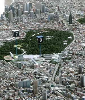 先日、東京都が、国際オリンピック選考委員の現地調査の過程でプレゼンした中に、都心の競技場の距離イメージを出すために造った「都心の模型」が有明の東京ビックサイトに展示されていた。 |